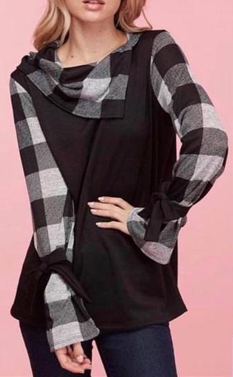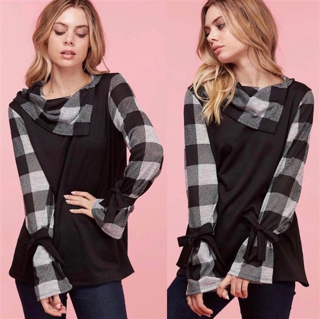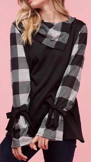 Our Black and White Checkered Tie Sleeve Top features a black and white checkered print trim, a draped flap collar and long flared sleeves with a tie around the arm.