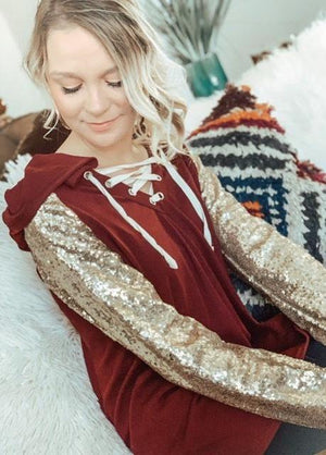 This Hacci Lace Up Knit Hoodie with Sequin Sleeves features a lace up knit material top and long sequin sleeves with sequins all the way down the sleeve.